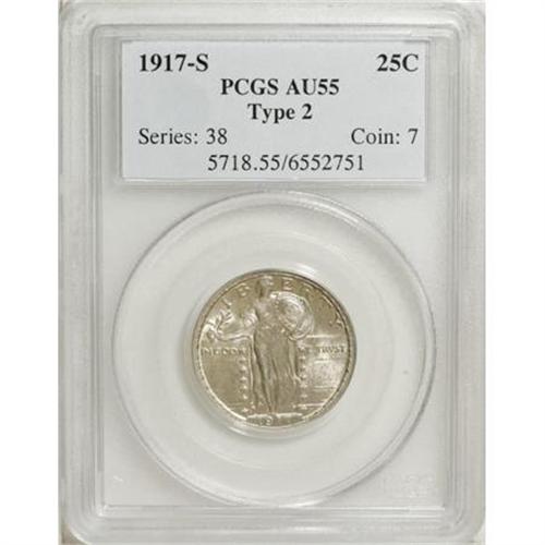 <B>1917-S 25C Type Two AU55 PCGS.</B></I> PCGS Population (42/415). NGC Census: (12/334). Mintage: 5,552,000. Numismedia Wsl. Price for NGC/PCGS coin in AU55: $142. (#5718)<BR><BR><B>Coin Engraver:</B> Hermon A. MacNeil<BR><BR><b>Shipping:</b> Coins & Currency (<a target="_blank" href="http://www.heritageauctions.com/common/shipping.php">view shipping information</a>)