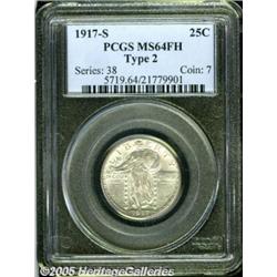 <B>1917-S 25C Type Two MS64 Full Head PCGS.</B></I> Fully struck, untoned, and seemingly pristine on the obverse, where a small die clash mark (as struck) rests in the upper left obverse field, touching the edge of Liberty's left (facing) shoulder. The reverse reveals softness on the eagle's breast, crisscrossing striations (as made) in the fields, and faint olive toning in the lower left quadrant. A very suitable near-Gem example of this issue. Population: 77 in 64, 61 finer (2/05).