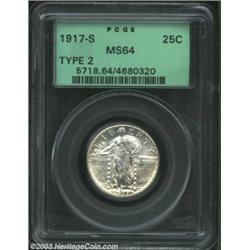1917-S 25C Type Two MS64 PCGS. The scarcest of all six of the 1917 issues, this brilliant piece has smooth, virtually unblemished surfaces and complete striking details throughout. Important notice: We expect to be auctioning lots at the rate of 200-250 per hour. On occasion eBay live bid software cannot keep up with the pace of the auctions where 4-5 lots per minute can hammer down, so we recommend that you place a realistic absentee bid now as insurance to avoid disappointment. Also please note that all Heritage/CAA lots purchased through eBay Live carry a 20% Buyer's Premium. Please make sure you read the Terms and Conditions.