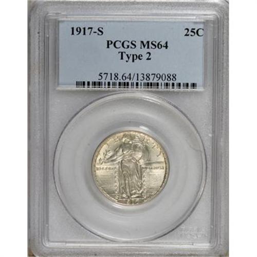 <B>1917-S 25C Type Two MS64 PCGS.</B></I> PCGS Population (109/85). NGC Census: (97/68). Mintage: 5,552,000. Numismedia Wsl. Price for NGC/PCGS coin in MS64: $555. (#5718)<BR><BR><B>Coin Engraver:</B> Hermon A. MacNeil<BR><BR><b>Shipping:</b> Coins & Currency (<a target="_blank" href="http://www.heritageauctions.com/common/shipping.php">view shipping information</a>)