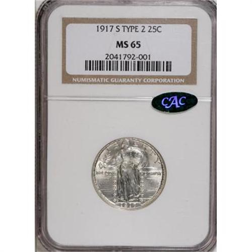 <B>1917-S 25C Type Two MS65 NGC. CAC.</B></I> Well struck with vibrant luster and minimal patina. The devices and the fields are equally well-preserved on this early San Francisco coin. Census: 47 in 65, 20 finer (11/07).<BR><BR><B>Coin Engraver:</B> Hermon A. MacNeil<BR><BR><b>Shipping:</b> Coins & Currency (<a target="_blank" href="http://www.heritageauctions.com/common/shipping.php">view shipping information</a>)