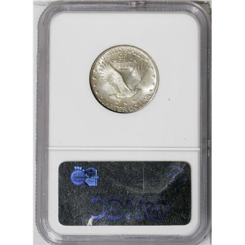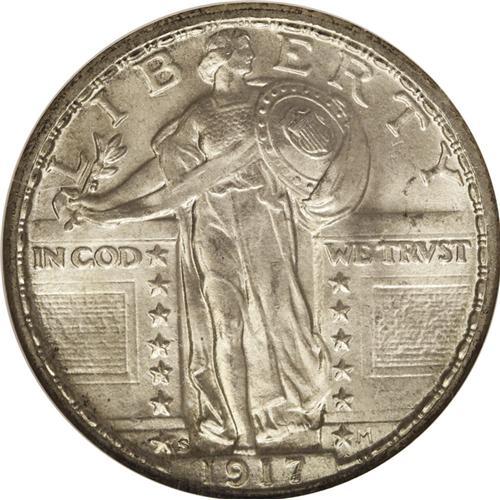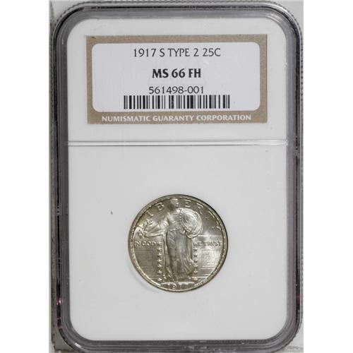 <B>1917-S<25C> Type Two MS66 Full Head NGC.</B></I> This lovely premium Gem is a beautiful example of this early mintmarked issue. The strike is impressive for a Standing Liberty quarter, irrespective of date. We call special attention to Liberty's head, the inner shield, the gown lines, and, on the reverse, the eagle's breast feathers. Scintillating mint frost overlays both sides and shimmers under the thin coating of natural color. Only the lightest overlay of silver-gray-golden iridescence is noted as the surfaces rotate under the light. The San Francisco Mint struck 5.5 million 1917-dated quarters of this type, fewer than 7% of which display Full Head definition (per Jay Cline). Census: 8 in 66, 4 finer (6/06).