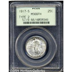<B>1917-S<25C> Type Two MS66 Full Head PCGS.</B></I> The 1917-S Type Two is three to five times scarcer than its D-mint counterpart, and probably five to ten times rarer than the Philadelphia Type Twos. This is an especially sharp example with strong definition on Liberty's head as well as the shield. Superb mint luster, much of the original brilliance remains with a smoky-brown accent of patina on each side. Population: 9 in 66, 6 finer (7/04). <BR><BR><B>Important notice:</B> Heritage usually auctions material at the rate of 200-250 lots per hour. On some occasions eBay Live bid software or the Internet may not be able to keep up with the pace of the auction. We recommend placing a realistic absentee bid now as insurance to avoid disappointment. Occasionally the auctioneer may eliminate or reject an eBay Live bid, and the auctioneer may also reopen a lot after the close of the eBay live bidding (usually because we missed an audience bid), and may reject your bid even if it shows you as the winning bidder. By bidding via eBay Live, you agree that Heritage may award the lot to another bidder at its sole discretion under the circumstances described above or any other reasonable circumstances. Since eBay bids are not shown to us until we open the lot on the floor, we treat those bids just like floor bids. In most cases the floor responds before the eBay bid is presented to us, due to Internet lag time, so for consistency we have made it a policy that floor bids are always considered first over tie eBay live bids. Also please note that all Heritage lots purchased through eBay Live carry a 20% Buyer's Premium. Please make sure you read the Terms and Conditions before you bid. </span></font></tr></table></td></tr></table>