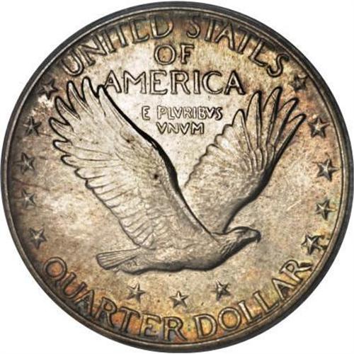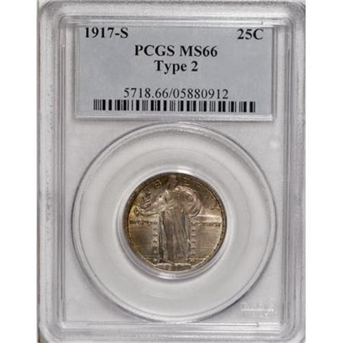 <B>1917-S 25C Type Two MS66 PCGS.</B></I> A marvelous blend of gold, lilac, and sky-blue patina resides of the highly lustrous surfaces of this Premium Gem. Excellent definition occurs on the motifs, especially the chain mail and the stripes of the inner shield. Both sides are impeccably preserved.<BR><BR><B>Coin Engraver:</B> Hermon A. MacNeil<BR><BR><b>Shipping:</b> Coins & Currency (<a target="_blank" href="http://www.heritageauctions.com/common/shipping.php">view shipping information</a>)