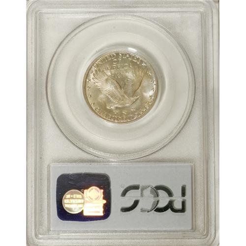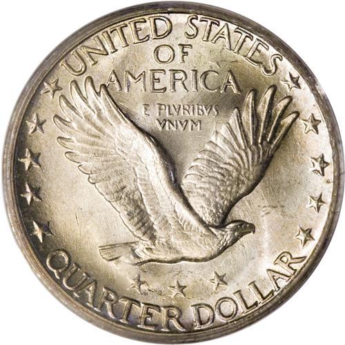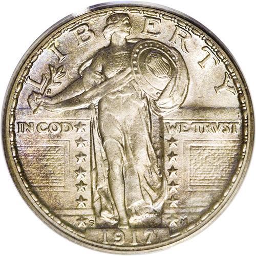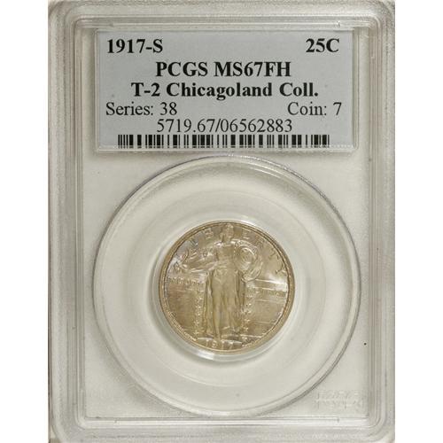 <B>1917-S 25C Type Two MS67 Full Head PCGS.</B></I> From the Chicagoland Collection, an important Standing Liberty quarter holding featured in our 2003 FUN Signature auction. The obverse is draped in pale violet and golden-rose patina, with blushes of steel-blue at the margins. Lighter golden and lilac shades cover the lustrous reverse. The strike is good, since the date, mintmark, and head are sharp while only a couple of shield rivets near the waist are soft. The obverse is immaculate, and close scrutiny is required to locate faint marks on the lower reverse. Memorable quality for this much scarcer S-mint from the first year of the Type Two design. Population: 7 in 67 Full Head, 0 finer (2/07).<BR><I>From The Encinitas Collection.</B></I><BR><BR><b>Shipping:</b> Coins & Currency (<a target="_blank" href="http://www.heritageauctions.com/common/shipping.php">view shipping information</a>)