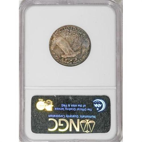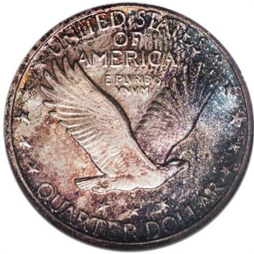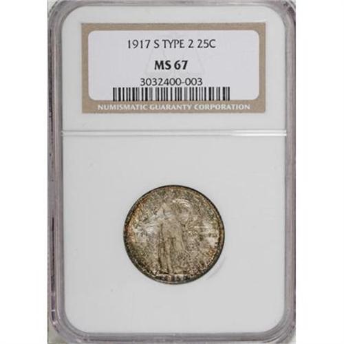 <B>1917-S 25C Type Two MS67 NGC.</B></I> The strike is strong, the mint luster is thick and frosted, and there are no reportable abrasions on either side. But then, that is what one would expect from an MS67. What is unexpected is the toning. Fabulous. The obverse has numerous small specks of mostly rose and blue with deeper golden-brown around the margin. The reverse shows irregular swipes of rose-golden with the same rich blue around much of the periphery. Obviously not fully struck, but sharply struck and close to Full Head status. Census: 1 in 67, 0 finer (7/07).<BR><BR><B>Coin Engraver:</B> Hermon A. MacNeil<BR><BR><b>Shipping:</b> Coins & Currency (<a target="_blank" href="http://www.heritageauctions.com/common/shipping.php">view shipping information</a>\)