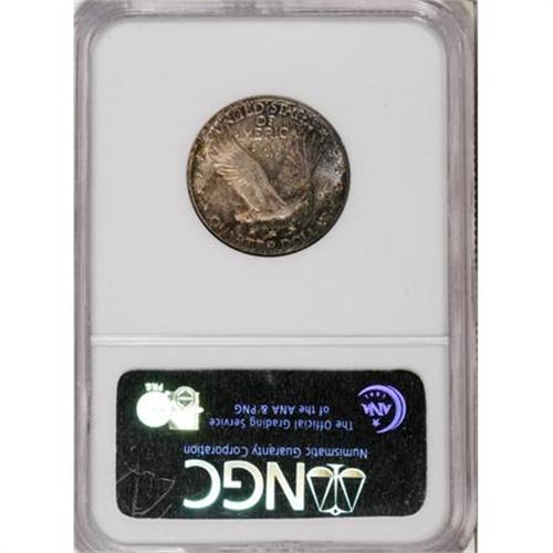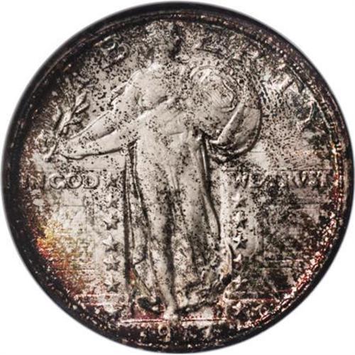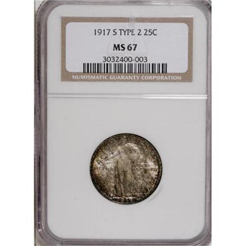 <B>1917-S 25C Type Two MS67 NGC.</B></I> The strike is strong, the mint luster is thick and frosted, and there are no reportable abrasions on either side. But then, that is what one would expect from an MS67. What is unexpected is the toning. Fabulous. The obverse has numerous small specks of mostly rose and blue with deeper golden-brown around the margin. The reverse shows irregular swipes of rose-golden with the same rich blue around much of the periphery. Obviously not fully struck, but sharply struck and close to Full Head status. Census: 1 in 67, 0 finer (7/07).<BR><BR><B>Coin Engraver:</B> Hermon A. MacNeil<BR><BR><b>Shipping:</b> Coins & Currency (<a target="_blank" href="http://www.heritageauctions.com/common/shipping.php">view shipping information</a>)