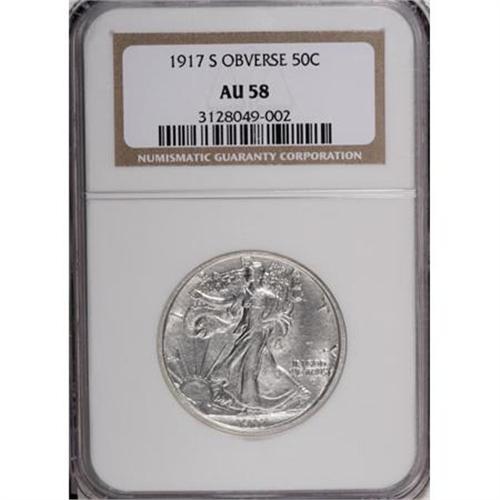 <B>1917-S 50C Obverse AU58 NGC.</B></I> The untoned silver-white surfaces show matte-like fields and a strong overall striking impression. Only Liberty's head is a tad weak. Traces of highpoint friction limit the grade. This version of the '17-S quarter is much scarcer than its reverse mintmark counterpart.<BR><BR><B>Coin Engraver:</B> Adolph A. Weinman<BR><BR><b>Shipping:</b> Coins & Currency (<a target="_blank" href="http://www.heritageauctions.com/common/shipping.php">view shipping information</a>)