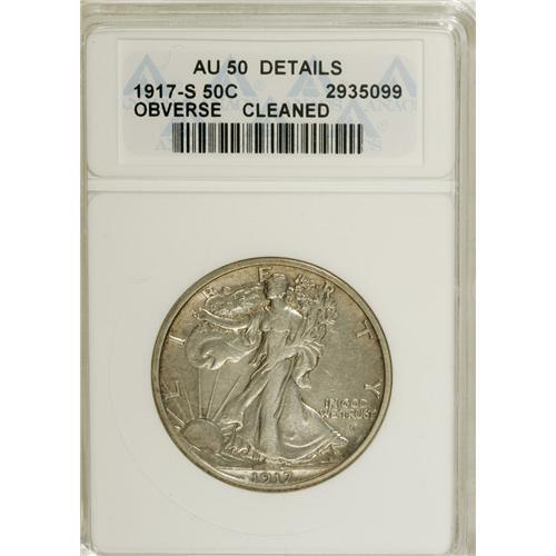 <B>1917-S 50C Obverse--Cleaned--ANACS. AU50 Details.</B></I> NGC Census: (5/213). PCGS Population (0/0). Mintage: 952,000. Numismedia Wsl. Price for NGC/PCGS coin in AU50: $925. (#6572)<BR><BR><b>Shipping:</b> Coins & Currency (<a target="_blank" href="http://www.heritageauctions.com/common/shipping.php">view shipping information</a>)