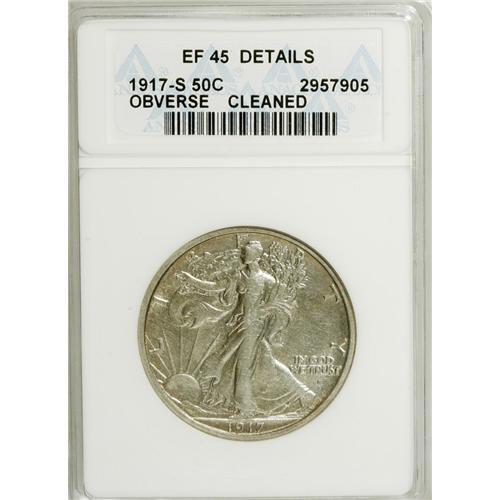 <B>1917-S 50C Obverse--Cleaned--ANACS. XF45 Details.</B></I> NGC Census: (13/218). PCGS Population (18/321). Mintage: 952,000. Numismedia Wsl. Price: $681. (#6572)<BR><BR><b>Shipping:</b> Coins & Currency (<a target="_blank" href="http://www.heritageauctions.com/common/shipping.php">view shipping information</a>)