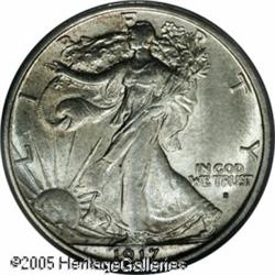 <B>1917-S 50C Obverse MS63 PCGS.</B></I> The Half Dollars of 1917 have five different variations of mints and mintmark placements. The 1917-S Obverse is the scarcest of these five variations, and it is also one of the most difficult early Walkers at the Mint State level. This piece is fairly well struck and shows a virtual absence of toning over the satiny, matte-like surfaces. Minimally abraded for the assigned grade. Lot:7942