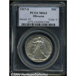 <table><tbody><tr><td><table> <TR><TD width="100%"><TABLE cellSpacing=1 cellPadding=3 width="100%" border=0><TBODY><TR><TD width="100%" bgColor=#79735c><FONT face=arial color=#ffffff size=3><B>Description</B> </FONT></TD></TR><TR><TD width="100%" bgColor=#ffffff><FONT face=arial size=2><B>1917-S 50C Obverse MS63 PCGS.</B></I> A Select example of this difficult obverse mintmark issue, with satiny, matte-like surfaces and virtually no noticeable marks. Lightly patinated on both sides in mottled gray and rose-gold hues. </FONT></TD></TR></TBODY></TABLE></TD></TR></TBODY></TABLE><BR><A name=PricesRealized></A><TABLE cellSpacing=0 cellPadding=0 width="100%" bgColor=#000000 border=0><TBODY><TR><TD width="100%"><TABLE cellSpacing=1 cellPadding=3 width="100%" border=0><TBODY><TR><TD width="100%" bgColor=#79735c><A name=PR><FONT face=arial color=#ffffff size=3><B>Previous Prices from Heritage Auctions</B> </FONT></A></TD></TR><TR><TD bgColor=#f6f6ed><TABLE cellSpacing=0 cellPadding=0 width="100%" border=1><TBODY><TR><TD align=middle width="33%"><B>Date</B></TD><TD align=middle width="33%"><B>Service</B></TD><TD align=middle width="33%"><B>Price</B></TD></TR><TR bgColor=whitesmoke><TD width="33%"><B>11/19/2002</B></TD><TD width="33%">ANACS</TD><TD width="33%">$2,415.00</TD></TR><TR bgColor=whitesmoke><TD width="33%"><B>03/23/2003</B></TD><TD width="33%">NGC</TD><TD width="33%">$3,910.00</TD></TR><TR bgColor=whitesmoke><TD width="33%"><B>03/23/2003</B></TD><TD width="33%">PCGS</TD><TD width="33%">$3,450.00</TD></TR><TR bgColor=whitesmoke><TD width="33%"><B>01/11/2003</B></TD><TD width="33%">ANACS</TD><TD width="33%">$3,565.00</TD></TR><TR bgColor=whitesmoke><TD width="33%"><B>06/08/2002</B></TD><TD width="33%">PCGS</TD><TD width="33%">$3,795.00</TD></TR><TR bgColor=whitesmoke><TD width="33%"><B>01/12/2002</B></TD><TD width="33%">ANACS</TD><TD width="33%">$3,277.50</TD></TR><TR bgColor=whitesmoke><TD width="33%"><B>10/06/2001</B></TD><TD width="33%">PCGS</TD><TD width="33%">$3,622.50</TD></TR><TR bgColor=whitesmoke><TD width="33%"><B>08/17/1996</B></TD><TD width="33%">NGC</TD><TD width="33%">$3,630.00</TD></TR></TBODY></TABLE></TD></TR><TR><TD bgColor=#ffffff><FONT face=arial size=1 ?>PLEASE NOTE: All prices realized reflect the final hammer price PLUS the buyer's premium in auctions that charge a buyer's premium. Each item has a notation at the top of the listing indicating whether that lot included a buyer's premium. Example: A item that sells with a final hammer price of $100 and a 20% buyer's premium will display with a price realized of $120. All information listed is intended to be as accurate as possible, but errors are possible. Please use this guide carefully and inform us of any inaccuracies. </FONT></TD></TR></TBODY></TABLE></TD></TR></TBODY></TABLE><BR><TABLE cellSpacing=0 cellPadding=0 width="100%" bgColor=#000000 border=0><TBODY><TR><TD width="100%"><TABLE cellSpacing=1 cellPadding=3 width="100%" border=0><TBODY><TR><TD width="100%" bgColor=#79735c colSpan=6><FONT face=arial color=#ffffff size=3><B>Price Guide*</B> </FONT></TD></TR><TR bgColor=#f6f6ed><TD align=middle><B>Grade</B> </TD><TD align=middle><B>Coin World<BR>(Trends)</B> </TD><TD align=middle><B>Numismedia<BR>Retail</B> </TD><TD align=middle><B>Numismedia<BR>Wholesale</B> </TD><TD align=middle><B>Coin<BR>Universe</B> </TD><TD align=middle><B>Heritage<BR>Value Index</B> </TD></TR><TR bgColor=#ffffff><TD align=middle>62</TD><TD align=right>$3,000.00</TD><TD align=right>---</TD><TD align=right>$2,075.00</TD><TD align=right>---</TD><TD align=right>$2,314.44</TD></TR><TR style="FONT-WEIGHT: bold" bgColor=#cccfdd><TD align=middle>63</TD><TD align=right>$4,500.00</TD><TD align=right>---</TD><TD align=right>$3,800.00</TD><TD align=right>$4,100.00</TD><TD align=right>$3,172.50</TD></TR><TR bgColor=#ffffff><TD align=middle>64</TD><TD align=right>$7,000.00</TD><TD align=right>---</TD><TD align=right>$5,275.00</TD><TD align=right>$6,500.00</TD><TD align=right>$5,158.75</TD></TR><TR bgColor=#ffffff><TD colSpan=6><FONT size=1>*All information listed is intended to be as accurate as possible, but errors are possible. No item may be returned or refused based on this information which is provided as a service to our customers. You should contact each pricing source directly to determine the accuracy of this information. </FONT></TD></TR></TBODY></TABLE></TD></TR></TBODY></TABLE><BR><TABLE cellSpacing=0 cellPadding=0 width="100%" bgColor=#000000 border=0><TBODY><TR><TD width="100%"><TABLE cellSpacing=1 cellPadding=3 width="100%" border=0><TBODY><TR><TD width="100%" bgColor=#79735c><FONT face=arial color=#ffffff size=3><B>Population Guide</B> </FONT></TD></TR><TR bgColor=#ffffff><TD align=middle><!-- Begin Output of Population Grid--><TABLE cellSpacing=0 cellPadding=0 width="100%" border=0><TBODY><TR><TD vAlign=center><TABLE cellSpacing=0 width="100%" border=1 cellsadding="3"><TBODY><TR><TD vAlign=center><TABLE cellSpacing=0 cellPadding=3 width="100%" border=1><TBODY><TR><TD vAlign=center align=middle bgColor=#f0f1e8 colSpan=2 <CENTER><FONT face=Arial size=2><B>PCGS Pop </B></FONT><CENTER></CENTER></TD><TD vAlign=center align=middle bgColor=#f0f1e8 colSpan=2><CENTER><FONT face=Arial size=2><B>NGC Pop</B></CENTER></FONT></TD></TR><TR><TD vAlign=center><FONT face=Arial size=2>(63)</FONT> </TD><TD vAlign=center align=right><FONT face=Arial size=2>42</FONT> </TD><TD vAlign=center><FONT face=Arial size=2>(63)</FONT> </TD><TD vAlign=center align=right><FONT face=Arial size=2>23</FONT> </TD></TR><TR><TD vAlign=center><FONT face=Arial size=2>(>63)</FONT> </TD><TD vAlign=center align=right><FONT face=Arial size=2>98</FONT> </TD><TD vAlign=center><FONT face=Arial size=2>(>63)</FONT> </TD><TD vAlign=center align=right><FONT face=Arial size=2>47</FONT> </TD></TR></TBODY></TABLE></TD></TR></TBODY></TABLE></TD></TR></TBODY></TABLE><!-- End Output of Population Grid--></TD></TR></TBODY></TABLE></TD></TR></TBODY></TABLE><BR><TABLE cellSpacing=0 cellPadding=0 