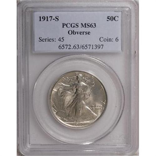 <B>1917-S 50C Obverse MS63 PCGS.</B></I> San Francisco struck fewer than a million halves in 1917 before the mintmark changed positions from the obverse to the reverse. On this piece, while Liberty's branch hand shows only partial detail, the eagle exhibits unusual sharpness, though it also has a point of weakness on the inside of the leg. A frosty Select example from this lower-mintage issue, one that displays just a touch of color in the fields.<BR><BR><b>Shipping:</b> Coins & Currency (<a target="_blank" href="http://www.heritageauctions.com/common/shipping.php">view shipping information</a>)