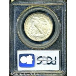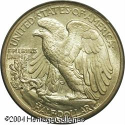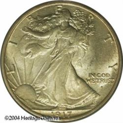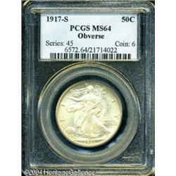 1917-S 50C Obverse MS64 PCGS. The '17-S Obverse is <B>1917-S 50C Obverse MS64 PCGS.</B></I> The '17-S Obverse is the scarcest of the five mintmark variations of this issue, and it is ranked second in the series next to the 1919-S in rarity in Mint State. It is also an important strike rarity, and this piece has strong definition on the eagle's plumage on the reverse, with the only area of softness being on the figure of Liberty. The luster characteristics are exceptional and there is a light amount of rich golden color evident. <BR><BR><B>Important notice:</B> Heritage usually auctions material at the rate of 200-250 lots per hour. On some occasions eBay Live bid software or the Internet may not be able to keep up with the pace of the auction. We recommend placing a realistic absentee bid now as insurance to avoid disappointment. Occasionally the auctioneer may eliminate or reject an eBay Live bid, and the auctioneer may also reopen a lot after the close of the eBay live bidding (usually because we missed an audience bid), and may reject your bid even if it shows you as the winning bidder. By bidding via eBay Live, you agree that Heritage may award the lot to another bidder at its sole discretion under the circumstances described above or any other reasonable circumstances. Since eBay bids are not shown to us until we open the lot on the floor, we treat those bids just like floor bids. In most cases the floor responds before the eBay bid is presented to us, due to Internet lag time, so for consistency we have made it a policy that floor bids are always considered first over tie eBay live bids. Also please note that all Heritage lots purchased through eBay Live carry a 20% Buyer's Premium. Please make sure you read the Terms and Conditions before you bid. This lot is being auctioned in conjunction with a live floor auction by Heritage Galleries & Auctioneers. All final auction and invoice information will be supplied by Heritage Galleries & Auctioneers, and all other information should be considered preliminary. Lot:6152
