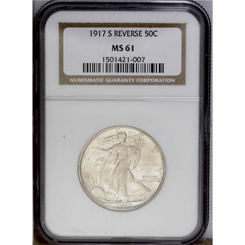 <B>1917-S<50C> Reverse MS61 NGC.</B></I> The strike is flat through the centers on this piece, and a light milky patina subdues the luster on both sides. A couple of reeding marks are noted in the right (facing) field. This coin should represent an affordable example of this popular key date. <BR><BR><B>Important notice:</B> Heritage usually auctions material at the rate of 200-250 lots per hour. On some occasions eBay Live bid software or the Internet may not be able to keep up with the pace of the auction. We recommend placing a realistic absentee bid now as insurance to avoid disappointment. Occasionally the auctioneer may eliminate or reject an eBay Live bid, and the auctioneer may also reopen a lot after the close of the eBay live bidding (usually because we missed an audience bid), and may reject your bid even if it shows you as the winning bidder. By bidding via eBay Live, you agree that Heritage may award the lot to another bidder at its sole discretion under the circumstances described above or any other reasonable circumstances. Since eBay bids are not shown to us until we open the lot on the floor, we treat those bids just like floor bids. In most cases the floor responds before the eBay bid is presented to us, due to Internet lag time, so for consistency we have made it a policy that floor bids are always considered first over tie eBay live bids. Also please note that all Heritage lots purchased through eBay Live carry a 20% Buyer's Premium. Please make sure you read the Terms and Conditions before you bid. This lot is being auctioned in conjunction with a live floor auction by Heritage Galleries & Auctioneers. All final auction and invoice information will be supplied by Heritage Galleries & Auctioneers, and all other information should be considered preliminary. Lot:2914 <BR><BR><B>Winning Notification and Billing:</B> After the FINAL session in this auction is complete, Heritage will send e-mail and snail mail invoices. This process normally takes several days. All final auction and invoice information will be supplied by Heritage Galleries & Auctioneers, and all other information should be considered preliminary. <BR><BR>This auction will be conducted on a live auction floor and over the Internet through eBay Live. If you choose to place an absentee bid, please take a moment to <font color='#0000ff'><u><a href='http://pages.ebay.com/liveauctions/help/before/laabsentee.html'>learn how eBay Live absentee bidding works</a></u></font><font color='#000000'>