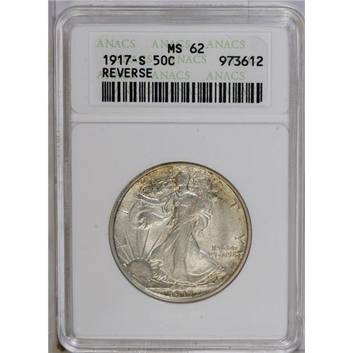 <B>1917-S<50C> Reverse MS62 ANACS.</B></I> Light gold and blue patina appears at the periphery of this coin, which has well-preserved surfaces for the grade. Typically struck for this issue with subtle luster.