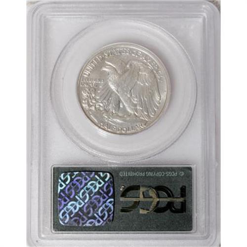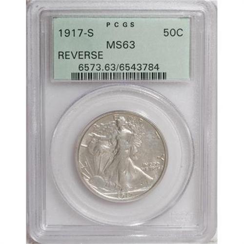 <B>1917-S 50C Reverse MS63 PCGS.</B></I> In 1917, the position of the mintmark on the Walking Liberty half changed from below IN GOD WE TRUST on the obverse to a place to the left of the rock on the reverse. Well struck with light golden patina on the obverse.<BR><BR><b>Shipping:</b> Coins & Currency (<a target="_blank" href="http://www.heritageauctions.com/common/shipping.php">view shipping information</a>)