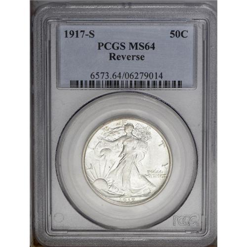 <B>1917-S<50C> Reverse MS64 PCGS.</B></I> A highly lustrous example with fully brilliant and frosty surfaces. A little weakly defined at the centers, along Liberty's skirt lines on the obverse and the eagle's breast and leg feathers on the reverse. The upper right obverse field near the border between R and T has a small patch of abrasions and tiny scratches. Both sides have radial flowlines from die wear, those on the reverse deforming the mintmark. <BR><BR><B>Important notice:</B> Heritage usually auctions material at the rate of 200-250 lots per hour. On some occasions eBay Live bid software or the Internet may not be able to keep up with the pace of the auction. We recommend placing a realistic absentee bid now as insurance to avoid disappointment. Occasionally the auctioneer may eliminate or reject an eBay Live bid, and the auctioneer may also reopen a lot after the close of the eBay live bidding (usually because we missed an audience bid), and may reject your bid even if it shows you as the winning bidder. By bidding via eBay Live, you agree that Heritage may award the lot to another bidder at its sole discretion under the circumstances described above or any other reasonable circumstances. Since eBay bids are not shown to us until we open the lot on the floor, we treat those bids just like floor bids. In most cases the floor responds before the eBay bid is presented to us, due to Internet lag time, so for consistency we have made it a policy that floor bids are always considered first over tie eBay live bids. Also please note that all Heritage lots purchased through eBay Live carry a 20% Buyer's Premium. Please make sure you read the Terms and Conditions before you bid. This lot is being auctioned in conjunction with a live floor auction by Heritage Galleries & Auctioneers. All final auction and invoice information will be supplied by Heritage Galleries & Auctioneers, and all other information should be considered preliminary. Lot:2915 <BR><BR><B>Winning Notification and Billing:</B> After the FINAL session in this auction is complete, Heritage will send e-mail and snail mail invoices. This process normally takes several days. All final auction and invoice information will be supplied by Heritage Galleries & Auctioneers, and all other information should be considered preliminary. <BR><BR>This auction will be conducted on a live auction floor and over the Internet through eBay Live. If you choose to place an absentee bid, please take a moment to <font color='#0000ff'><u><a href='http://pages.ebay.com/liveauctions/help/before/laabsentee.html'>learn how eBay Live absentee bidding works</a></u></font><font color='#000000'>