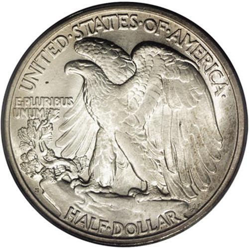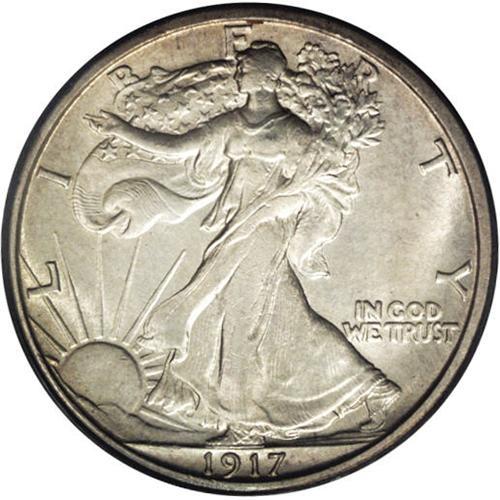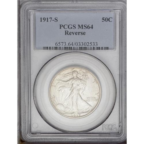 <B>1917-S<50C> Reverse MS64 PCGS.</B></I> Generally untoned and lustrous, with the thick mint frost peculiar to the first few years these were struck. There is a hint of light gold on the obverse periphery, and a scattering of tiny flecks of yellow-gold on the right side of the reverse. The strike is reasonably sharp on Liberty's thumb, but her skirt lines are weakly defined over her leg. A loupe will find some trivial handling nicks, none of which warrants attention, but must have been barely enough to keep this one from a Gem grade.