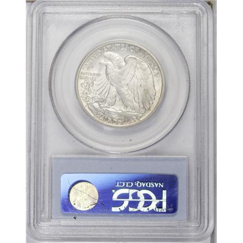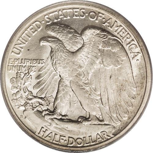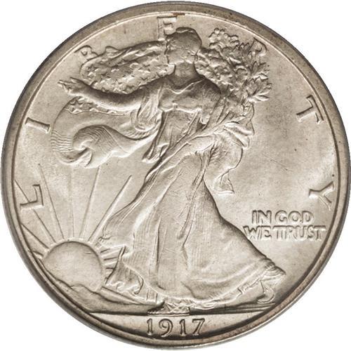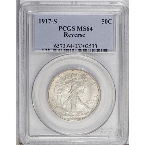 <B>1917-S 50C Reverse MS64 PCGS.</B></I> Generally untoned and lustrous, with the heavy mint frost peculiar to the first few years these were struck. There is a hint of light gold on the obverse periphery, and a scattering of tiny flecks of yellow-gold on the right side of the reverse. The strike is reasonably sharp on Liberty's thumb, but her skirt lines are weakly defined over her leg. A loupe will find some trivial nicks, none of which warrants attention, but must have been barely enough to keep this one from a Gem grade.<BR><BR><b>Shipping:</b> Coin/Currency (<a target="_blank" href="http://www.heritageauctions.com/common/shipping.php">view shipping information</a>)