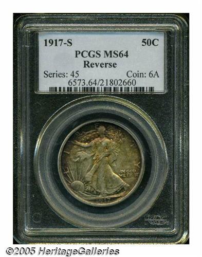 <B>1917-S<50C> Reverse MS64 PCGS.</B></I> Very scarce, especially in high grades, this piece is wholly original and displays above-average sharpness for this second year issue, with tonal accents of mottled pumpkin-orange and russet coloration. The underlying mint luster is especially strong and vibrant and serves to enhance the rich, original toning. A high-end MS64 that is very close to full Gem classification. Population: 168 in 64, 43 finer (5/05).