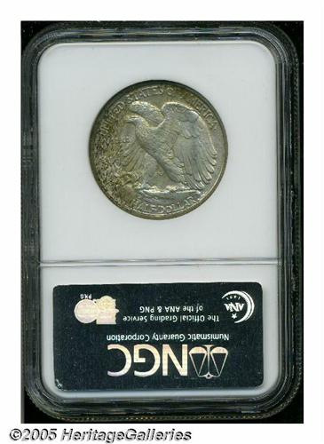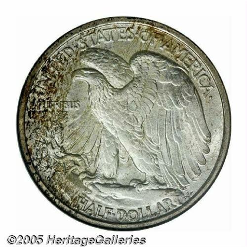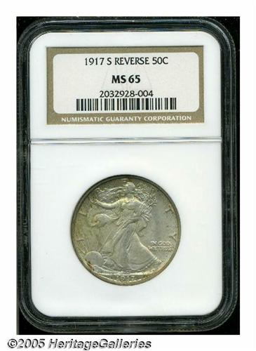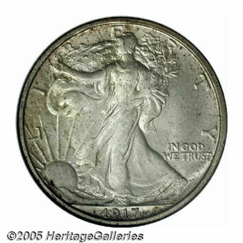 <B>1917-S<50C> Reverse MS65 NGC.</B></I> Even though 5.5 million pieces were produced of the 1917-S Reverse, it is nevertheless one of the keys to the series of early Walkers. This piece shows obvious originality as reflected by the dusky gray-golden surfaces with strong underlying mint luster. Very sharply struck for an early Walker, the hand and skirt definition on the obverse are especially noteworthy and the head of Liberty is almost completely brought up.<BR><I>From The Clifford Columbus Collection.</B></I>