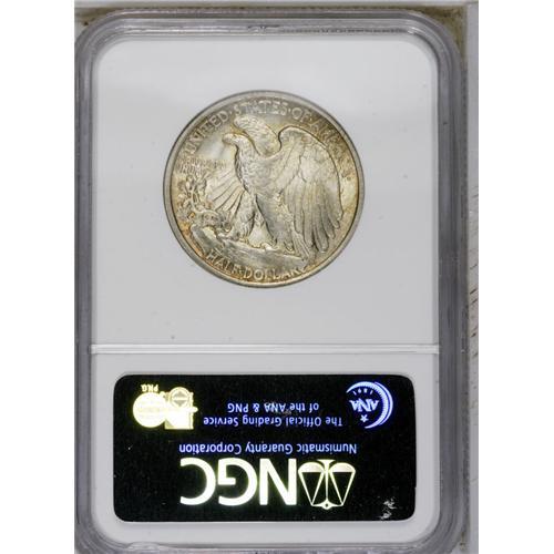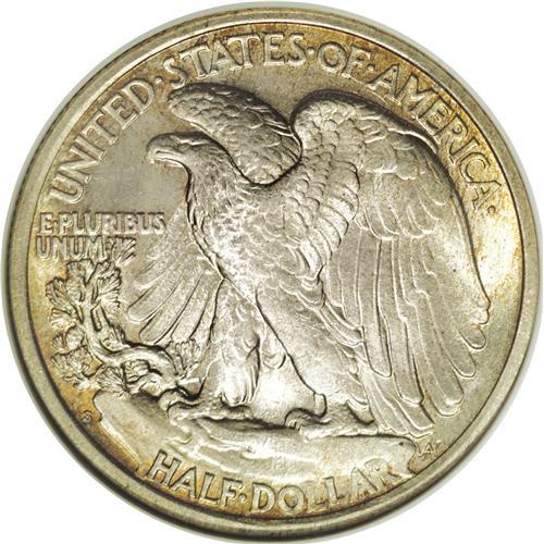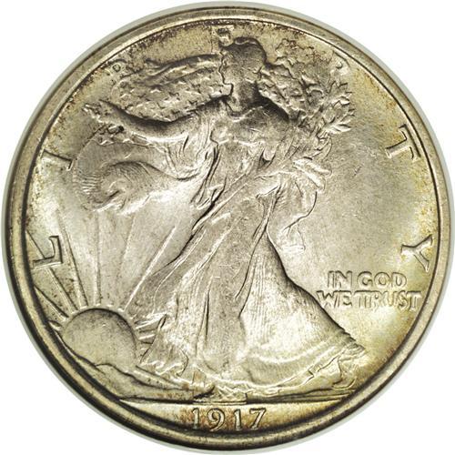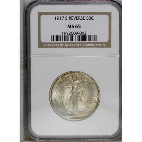 <B>1917-S<50C> Reverse MS65 NGC.</B></I> The appealing light-olive and amber patina on the obverse deepens on the reverse to olive-gold, with glints of sunset-orange, magenta, lemon-yellow, and jade-green in the protected areas near the periphery. While the 1917-S Obverse Mintmark is usually considered to be rarer and more desirable, that distinction blurs a great deal in Gem condition. In fact, judging by the population data, the 1917-S Reverse Mintmark variety appears equally elusive. Both services combined have graded equal numbers of each variety in MS65: 34 of each at PCGS, 16 of each at NGC (9/06).