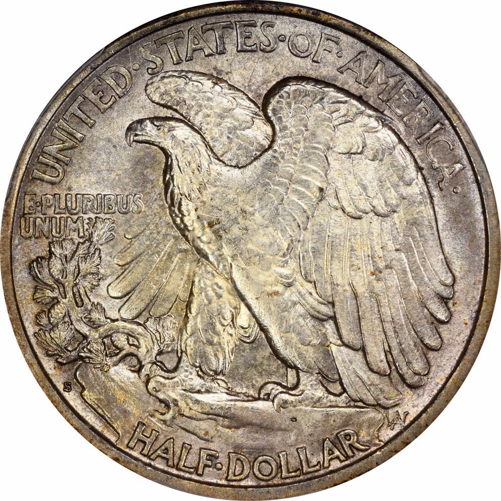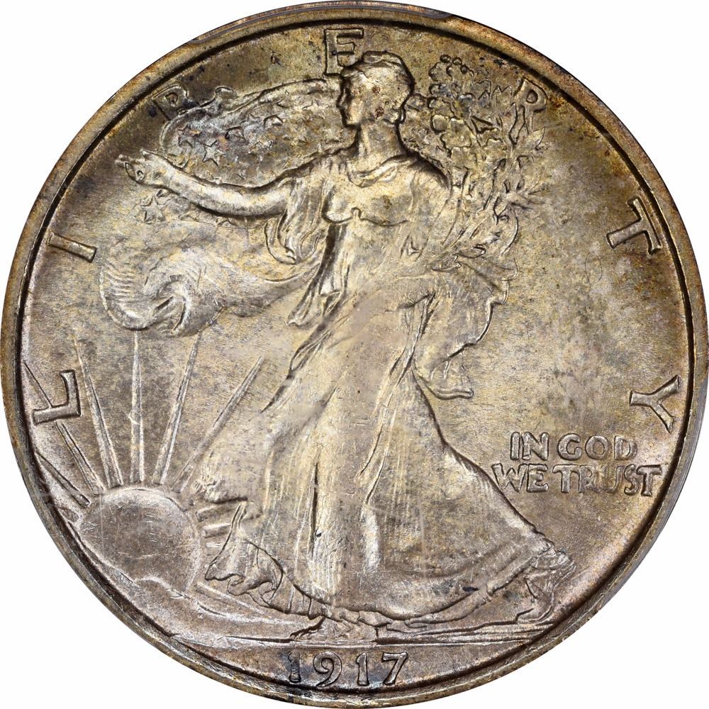 A crescent of deeply varied golden toning cascades around the obverse rim from 9 to 4 o’clock, softly blending into the pale pastel field -- the reverse rim and field enjoy much the same by way of toning but in somewhat lighter shades. The variety offered here with the mintmark on the reverse is the most readily available of the four issues of the year and pleasing examples such as this are often selected for mid to high-grade type sets. One for the toning specialists.