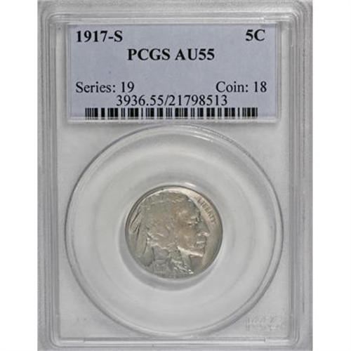 <B>1917-S 5C AU55 PCGS.</B></I> PCGS Population (31/463). NGC Census: (12/307). Mintage: 4,193,000. Numismedia Wsl. Price for NGC/PCGS coin in AU55: $233. (#3936)<BR><BR><B>Coin Engraver:</B> James E. Fraser<BR><BR><b>Shipping:</b> Coins & Currency (<a target="_blank" href="http://www.heritageauctions.com/common/shipping.php">view shipping information</a>)