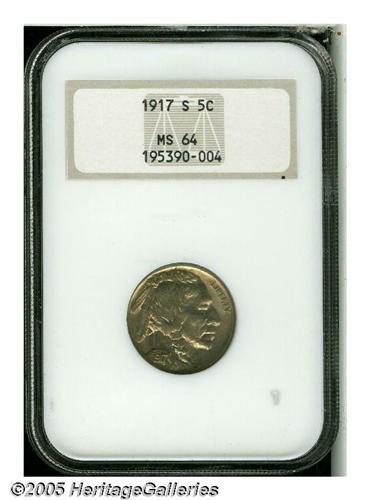 <B>1917-S<5C> MS64 NGC.</B></I> Even though 4.1 million pieces were struck of the 1917-S, it is a very scarce issue in all grades, and becomes quite challenging in the middle and upper Uncirculated grades. This date is usually weak in the peripheral elements, but the current example is an exception. It is generally well struck throughout, with strong definition on the date, LIBERTY, and on the reverse lettering and mintmark. Bright, lustrous surfaces display a light champagne patina, and no significant contact marks.