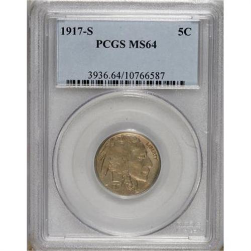 <B>1917-S 5C MS64 PCGS.</B></I> This near-Gem is extremely impressive for the grade, with crisply defined motifs and smooth, virtually pristine surfaces. Untoned with even olive-gray coloration and slightly muted luster that precludes a finer grade assessment. <BR><BR><b>Shipping:</b> Coins & Currency (<a target="_blank" href="http://www.heritageauctions.com/common/shipping.php">view shipping information</a>)