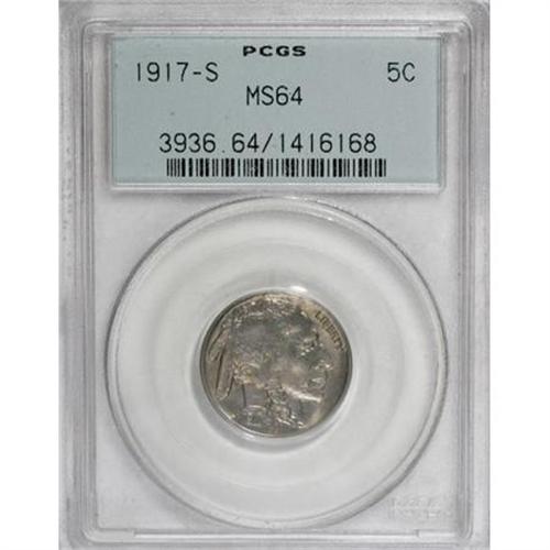 <B>1917-S 5C MS64 PCGS.</B></I> A sharply struck example of this low mintage S-mint issue. Autumn-brown and forest-green ensure the originality. Well preserved despite a faint slide mark on the flank. Encased in an old green label holder.<BR><BR><B>Coin Engraver:</B> James E. Fraser<BR><BR><b>Shipping:</b> Coins & Currency (<a target="_blank" href="http://www.heritageauctions.com/common/shipping.php">view shipping information</a>)