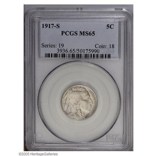 <B>1917-S<5C> MS65 PCGS.</B></I> Here is a perfect coin for the grade, the surfaces are outstanding and show just a couple of faint ticks when examined with a strong loupe. Toned with a blush of nickel-blue, and fully lustrous throughout. The strike will really set this one apart, as the bison is bold on his head, horn, and tail. Apparently a fairly early obverse die state, although strong clashing is seen below the Chief's chin. The reverse die is very early in its life, with crisp lettering right to the tops of each peripheral letter and again clashing is found near the motto. A tiny lamination appears on the reverse, hidden within the details of the bison. A coin that will be very hard to improve upon for the date specialist. Population: 64 in 65, 21 finer (9/05).