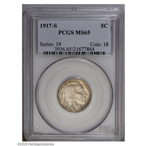 <B>1917-S<5C> MS65 PCGS.</B></I> Sharply struck and highly lustrous with excellent eye appeal. The surfaces are satiny with pale gray color. A touch of peripheral gold color accents both sides of this Gem. Population: 64 in 65, 21 finer (10/05).