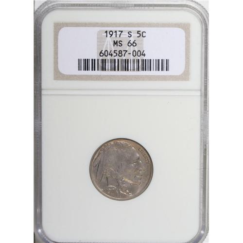 <B>1917-S 5C MS66 NGC.</B></I> Minted in comparatively small numbers for the era, the 1917-S is a challenging issue in Gem or better condition. This example is far sharper than the typical '17-S nickel, although slightly deficient at the central reverse as usual. Both sides have satiny luster beneath pale gold and iridescent toning. Census: 8 in 66, 0 finer (12/06).<BR><BR><b>Shipping:</b> Coin/Currency (<a target="_blank" href="http://www.heritageauctions.com/common/shipping.php">view shipping information</a>)