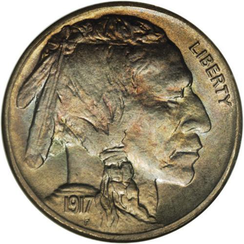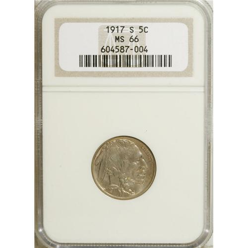 <B>1917-S 5C MS66 NGC.</B></I> Minted in comparatively small numbers for the era, the 1917-S is a challenging issue in Gem or better condition. This example is far sharper than the typical '17-S nickel, although slightly deficient at the central reverse as usual. Both sides have satiny luster beneath pale gold and iridescent toning. Census: 10 in 66, 0 finer (4/07).<BR><BR><b>Shipping:</b> Coins & Currency (<a target="_blank" href="http://www.heritageauctions.com/common/shipping.php">view shipping information</a>)