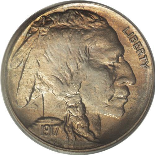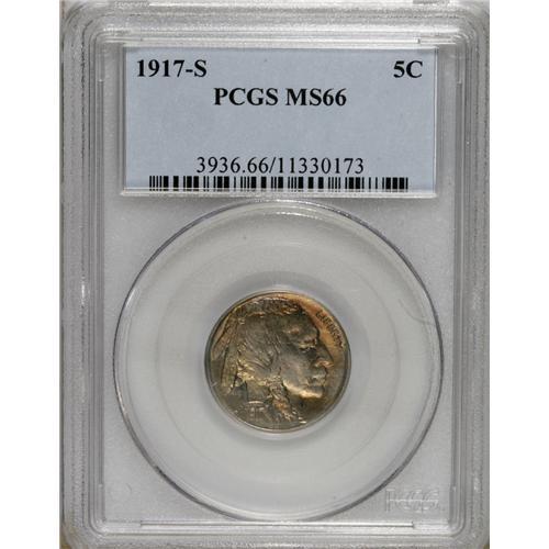 <B>1917-S 5C MS66 PCGS.</B></I> Deep golden-brown and medium-gray toning adorns the satiny, highly lustrous surfaces of this impressive Premium Gem. Well struck on all of the design elements, including the bison's head and shoulder. A couple of tiny marks on the bison's shoulder are only noticed under magnification. A splendidly preserved example of this early Buffalo nickel issue. Population: 23 in 66, 0 finer at either service (2/07).<BR><BR><b>Shipping:</b> Coins & Currency (<a target="_blank" href="http://www.heritageauctions.com/common/shipping.php">view shipping information</a>)