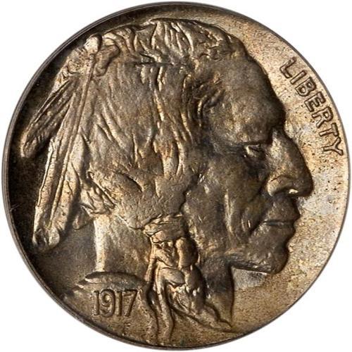<b>1917-S Buffalo Nickel. PCGS graded MS64.</b> Typically frosty for the issue, the nickel gray surfaces are nearly gem quality with few singularly distracting bagmarks and overlaid by nice warm golden to crimson brown toning. The imprint that was left by the dies lacks a certain clarity on most 1917-S nickels, but it is normal for this date and not overly intrusive here, mainly there is some rounding at the forehead of the buffalo <b>(PCGS # 3936)</b>