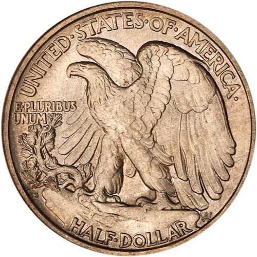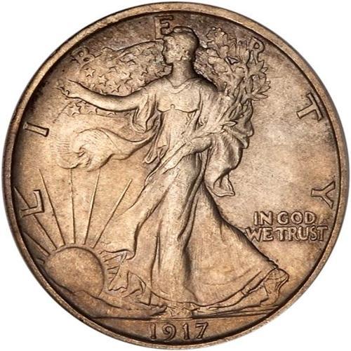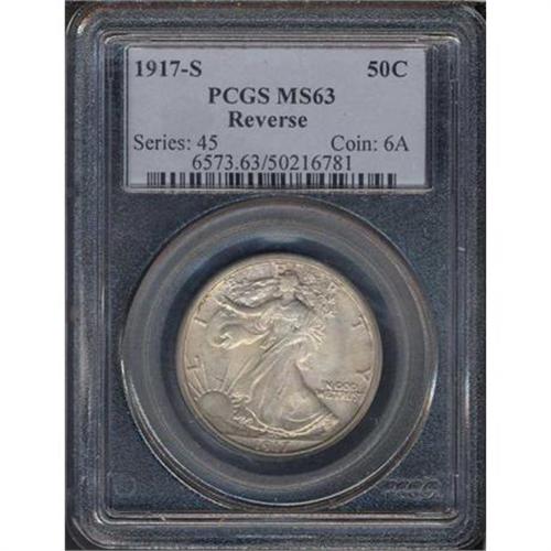 <b>1917-S Liberty Walking Half Dollar. Mint mark on reverse. PCGS graded MS63.</b> Both the milky toned color and satiny luster on this half dollar from the World War I era are simply outstanding, and only the presence of a few scattered field abrasions plus minor strike weakness precludes a higher rating. Not quite fully struck, with just a narrow region of weakness found on the thin lines of Liberty's skirt, her head, and on the eagle's leg and chest detail. The mintmark was moved to the reverse partway into 1917 for reasons never made public, but perhaps for aesthetic reasons <b>(PCGS # 6573)</b> <i>