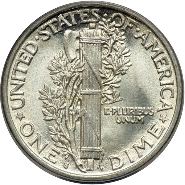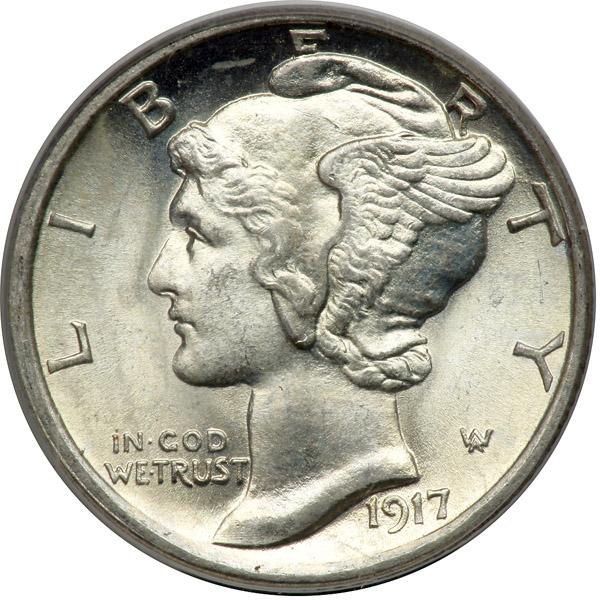 1917-S Mercury Dime. PCGS graded MS-66 Full Bands. Well struck and mostly white. A noticeably superior Gem with admirable luster and surfaces that are free from all but the most trifling luster grazes. Pop 62; 10 finer in 67FB (PCGS # 4915) .