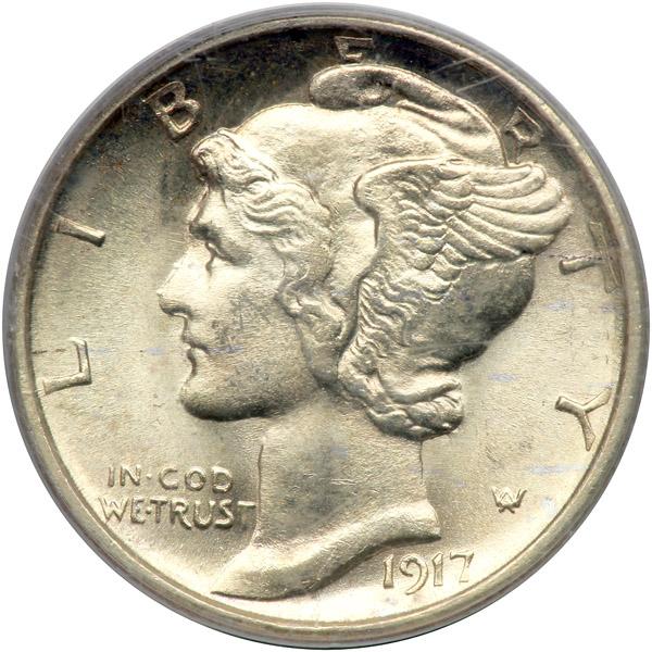 1917-S Mercury Dime. PCGS graded MS-65 Full Bands. Housed in an Old Green Holder. Mostly untoned with a hint of light gold tone, the eye appeal on this specimen just won't quit. Pop 103; 72 finer, 62 in 66FB, 10 in 67FB (PCGS # 4915) .