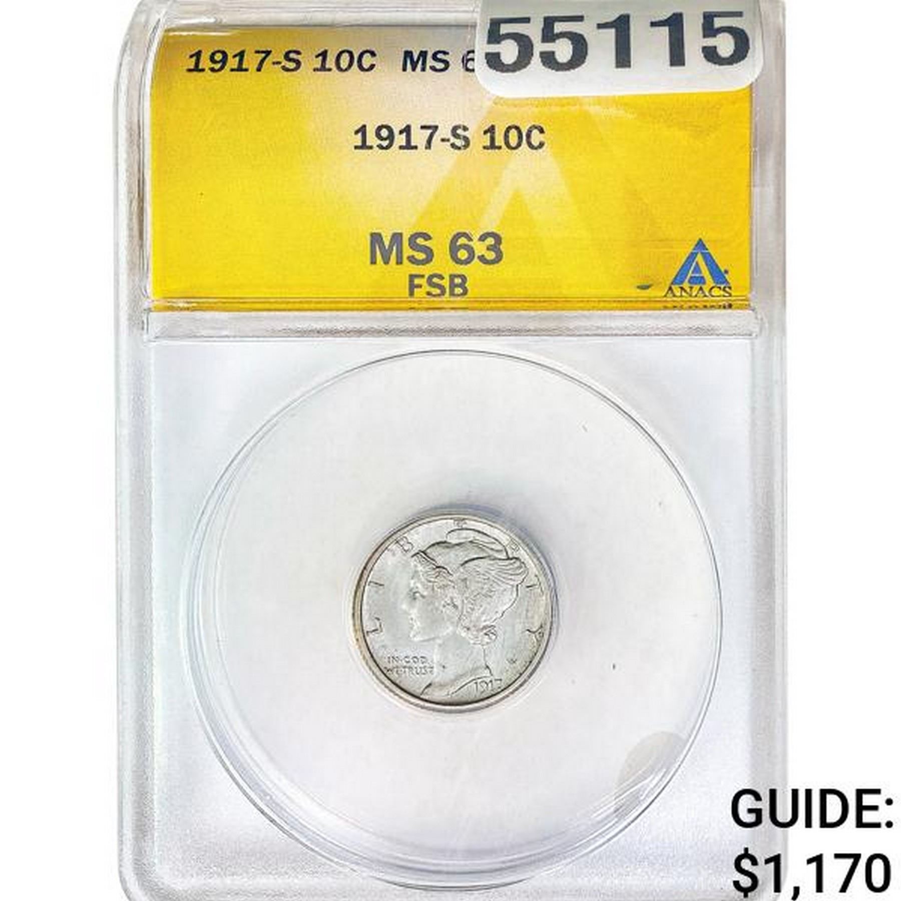 1917-S Mercury Dime ANACS MS63 FSB