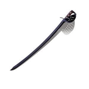 The blade is moderately curved with a short bevel grind and a long narrow fuller. When combined with a short, sharp, clip point, these features make for a very stiff, strong blade capable of delivering fearsome cuts and thrusts while shrugging off abuse that would break a lesser sword. To help protect it from rust, each blade is polished before being deeply blued to inky black perfection. Crafted from heavy gauge steel plate with rolled edges and multiple lightening holes and deeply blued like the blade its sturdy enough to absorb or shed the most horrendous blows. To match the sturdy guard and help control the awesome blade, the handle of our 1917 Saber is constructed from handsome, durable Rose Wood scales attached to the saber's full tang via three highly polished brass cutler's rivets. Each 1917 Saber is also supplied with a sturdy scabbard and frog. Made from thick, black leather. Features Blade Length: 31 inch Overall Length: 36 inch Steel: 1055 Carbon Weight: 42.1 oz Handle: 5 inch Scabbard: Leather Scabbard w/Brass and Copper Fittings Vendor Part #: 88CSSN Weight: 5.40