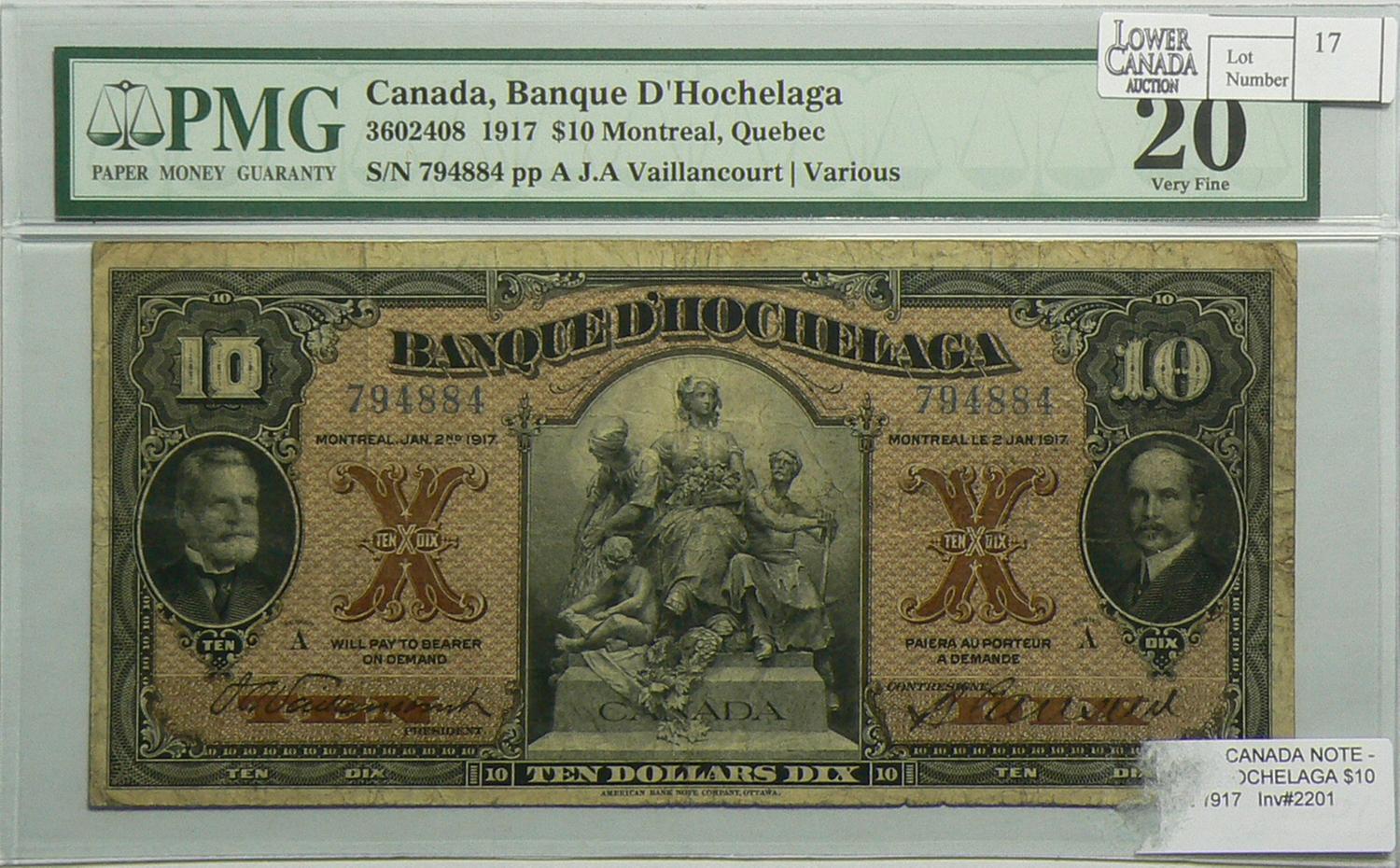1917 Ten Dollars Banque D'Hochelaga, 360-24-08, PMG VF-20, Vaillancourt, Series A, serial 794884.