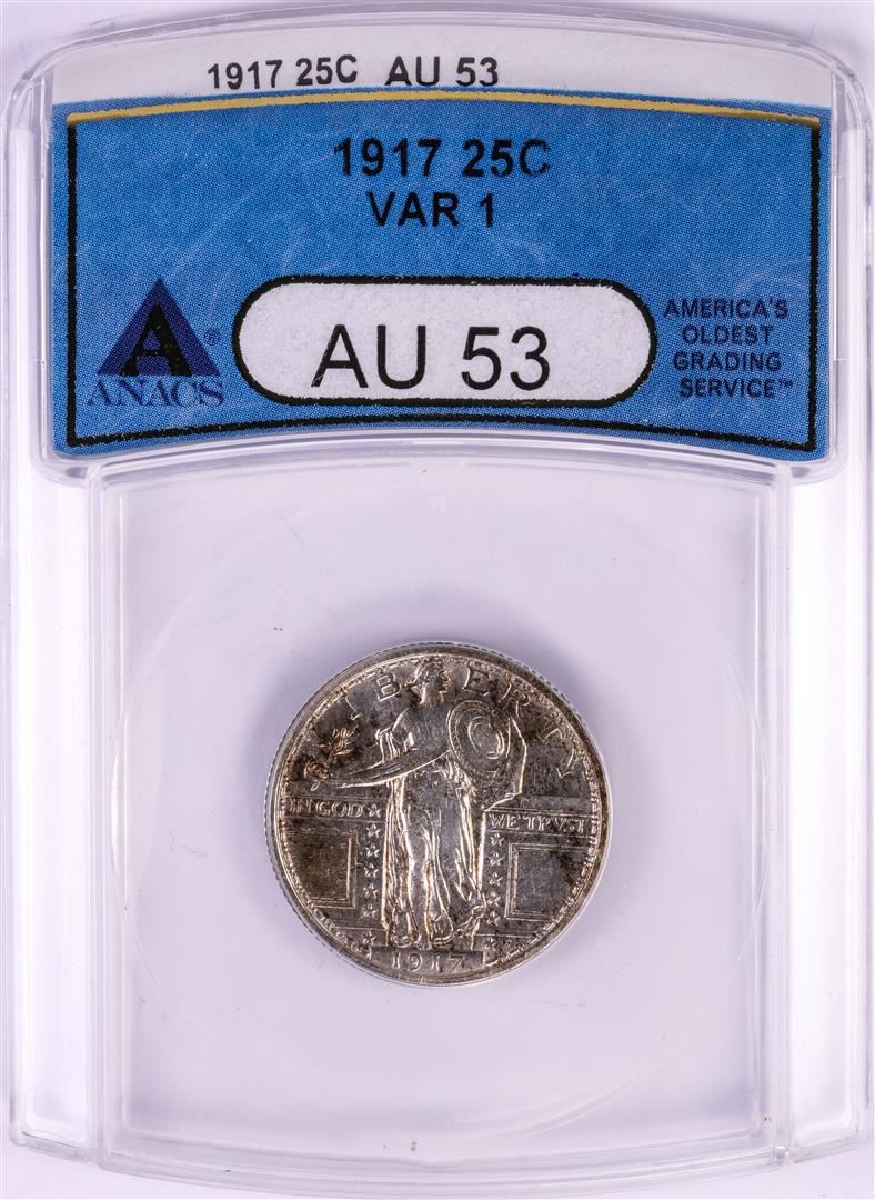 One 1917 Type 1 Standing Liberty Quarter Coin ANACS AU53. ANACS Certified.