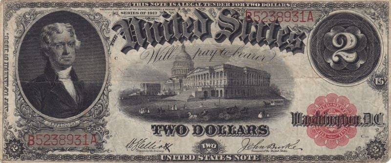 1917 United States $2 Two Dollar Bank Note - Large Bill Size, Red Seal - Fine + Condition
