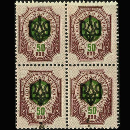 1917 Ukraine Odessa Regional 50 Kopek Stamp Overprinted on Russia Imperforate Mint Block of 4 (STM-0