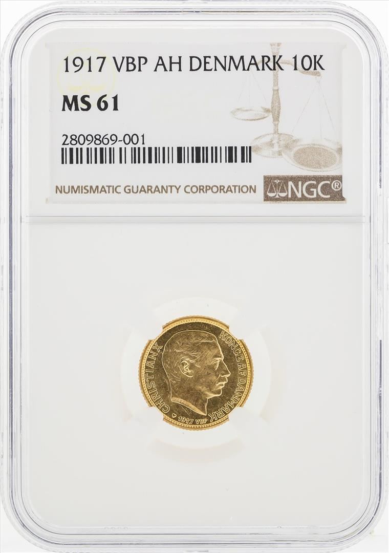 One 1917 VBP AH Denmark 10 Kroner Gold Coin NGC MS61. NGC Certified.
