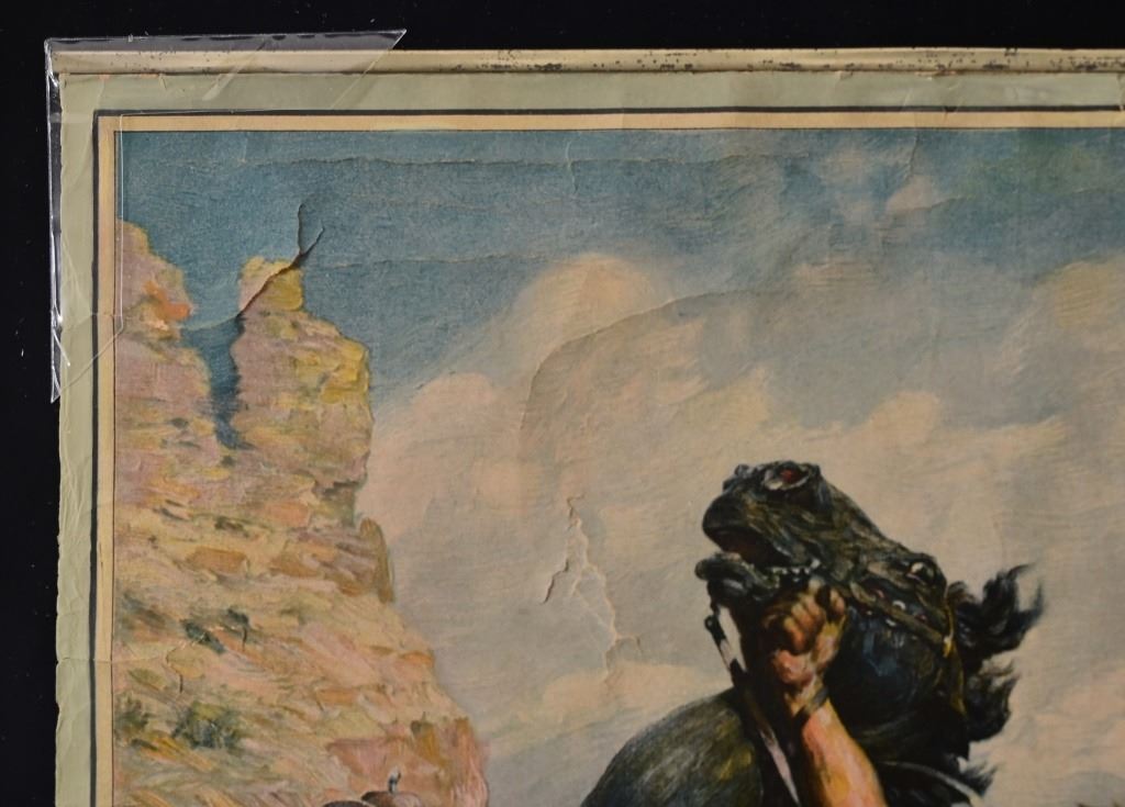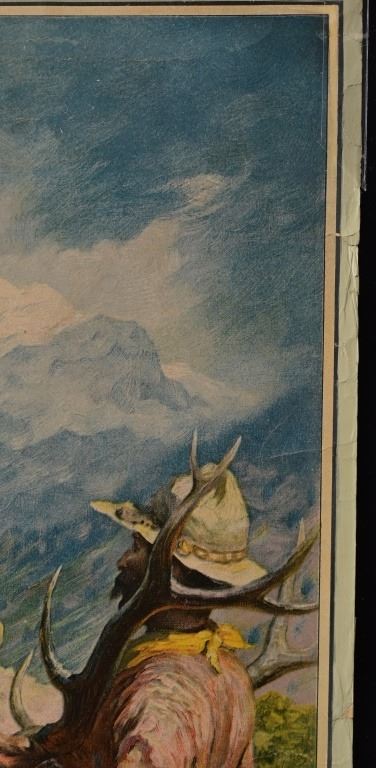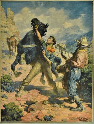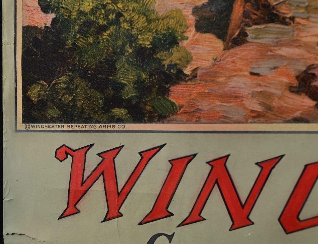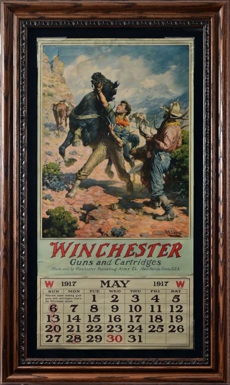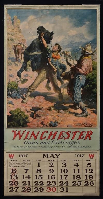 Extremely Rare, 1917 Calendar for Winchester Guns and Cartridges. Winchester Repeating Arms Co. Depicting cowboy trying to calm horse by artist W. R. Leigh (1866-1955). Great action packed and colorful graphics. This is one of, if not, the most sought after firearms and gunpowder calendars by advance collectors. Original top band, May-Dec pages. Edgewear, minor wrinkles, a couple tears toward bottom below lettering. 15 1/4 X 30 1/4 inches. Nicely done oak frame measures 22.75" x 37.5".