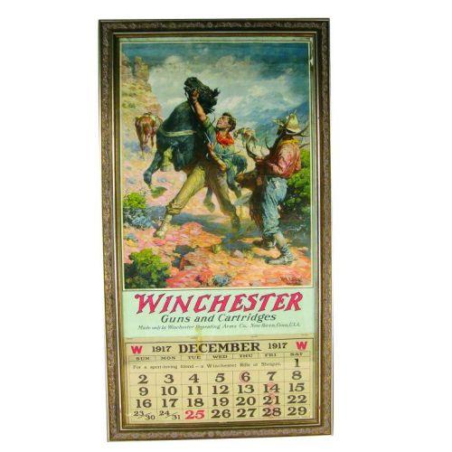 1917 Winchester Calendar, W.R. Leigh artist. This is the only commercial piece W. R. Leigh did. He needed money and Winchester had asked him to paint a calendar image. He did but insisted that Winchester leave their logo out of the image. This is the only calendar with the Winchester logo out of the image area. Original band on top, Dec. page only, framed under glass. Paper loss at 1:00, tape residue over word Dec and a few horizontal creases otherwise good condition. 15 X 30 inches.